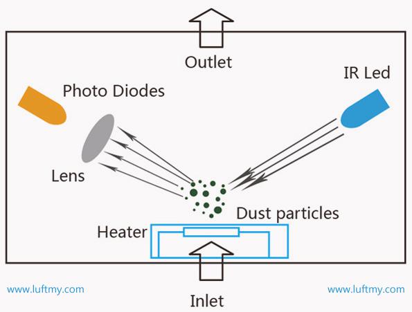 微粒和分子在光的照射下會造成光的散射并吸收部分照射光的能量。使得光強(qiáng)將被衰減。通過檢測光通過被測區(qū)域后的衰減率程度,或者光通過被測區(qū)域時的散射量,可獲得被測區(qū)域灰塵的濃度。
